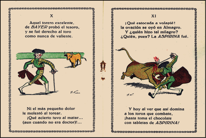 Entre los laboratorios extranjeros, Bayer editó uno de esos cuentecitos a que hemos hecho referencia en entregas anteriores, redactado por J. Pérez de Zúñiga e ilustrado por J. Xaudaró, especialmente bueno, en donde se nos habla de una corrida salvada, evidentemente gracias a la aspirina (Figura 7).