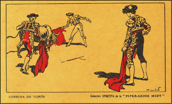 La Piperazine Midy fue un medicamento francés dedicado a prevenir y curar los cólicos renales. Tuvo una difusión muy amplia por Europa y América y se publicitó, entre otras cosas, mediante un sistema de tarjetas postales (8,5 x 13,5 cm). Muy acertadamente, en la serie dedicada a los deportes incluyó la corrida de toros. Nada de cultura o Bellas Artes, para ellos simple deporte (Figura 8).