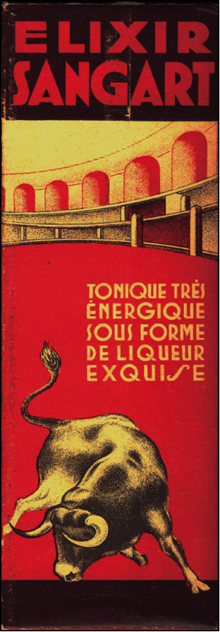 Los franceses, también a principios del siglo XX, se atrevieron a decorar muy hermosamente, el envase del Elixir Sangart, un tónico poderoso, que encontramos en el mismísimo marché aux pouces de París, con un hermoso y fiero toro en medio de un coso modernista (Figura 9).