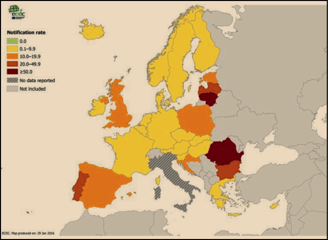 Figura 1. Prevalencia (número de casos anuales notificados) de tuberculosis en la UE/EEA (Fuente: ECDC).