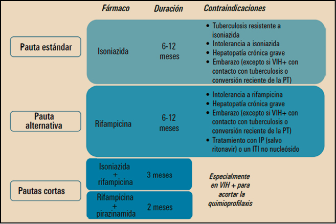 - Recién nacidos de madres con tuberculosis pulmonar activa. Es frecuente la transmisión perinatal, por lo que se debería administrar isoniazida durante 3 meses (3H) y después la pauta como en la quimioprofilaxis primaria (si la prueba de la tuberculina es negativa y la radiología de tórax normal, pueden suspenderse la isoniazida).