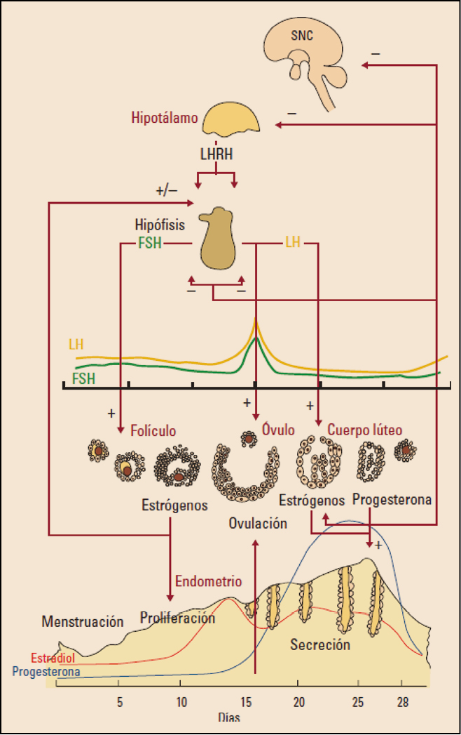 La secreción de LH y FSH está regulada por la hormona liberadora de gonadotropinas (GnRH o LHRH), producida forma pulsátil por el hipotálamo, actuando sobre la adenohipófisis para inducir la síntesis y la secreción de LH y FSH. Pero éstas también son reguladas a través de un feedback negativo de los estrógenos y la progesterona, de forma que, si se interrumpe la síntesis y secreción de los esteroides sexuales por extirpación quirúrgica de los ovarios o al producirse el agotamiento folicular con la llegada de la menopausia, se produce un aumento marcado de ambas gonadotropinas, siendo la FSH la más sensible. Los receptores para GnRH se encuentran también sometidos a regulación negativa por parte de la inhibina y a un cierto efecto estimulante por parte de la activina. La reiteración del estímulo pulsátil con GnRH en presencia de una concentración de gonadotropinas incrementada produce, en un determinado momento, una liberación máxima de dichas gonadotropinas, lo que constituye el pico ovulatorio.