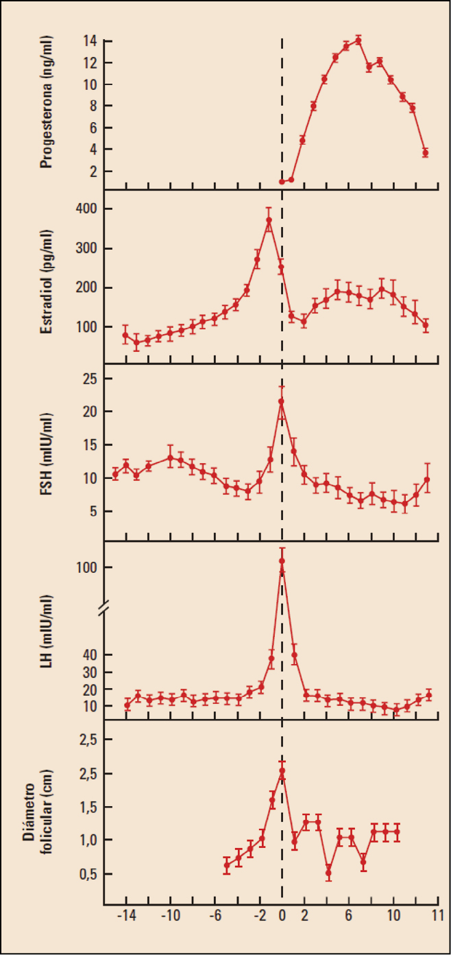 A través de estos mecanismos de regulación, en la mitad del ciclo aparece un pico secretor de LH y FSH que parece ser responsable de la ovulación y de la luteinización. La FSH actúa sobre el folículo, que ha alcanzado ya una fase avanzada (folículo antral) aunque mida todavía muy pocos milímetros.