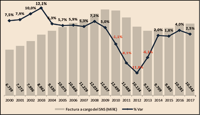 Como se puede observar en la Figura 1, la factura farmacéutica a cargo del SNS, que registró una importante disminución entre 2010 y 2013 como consecuencia de las medidas de control del gasto que se adoptaron en ese periodo, retomó en 2014 tasas de crecimiento positivas que ha llevado a situar la factura de 2017 ligeramente por debajo de la factura del año 2006: 10.542 millones de euros en 2017 frente a 10.666 millones de euros en 2006.