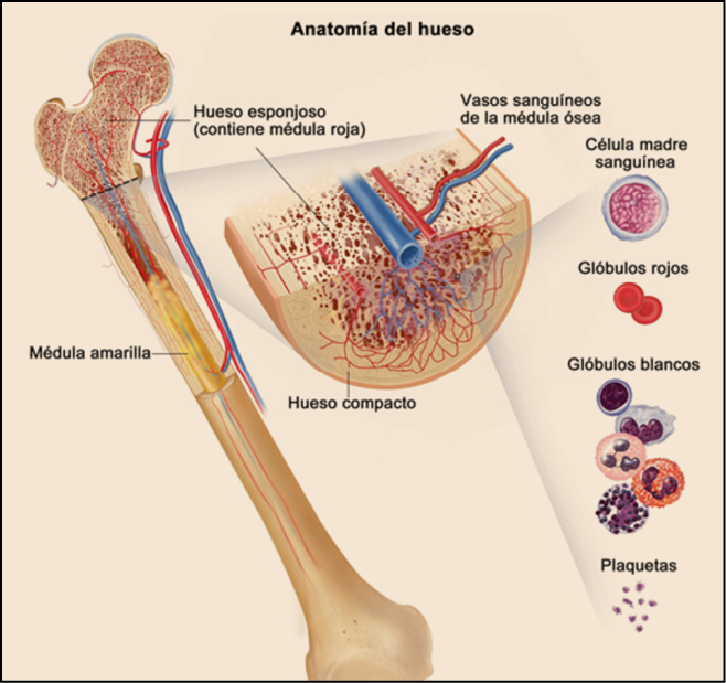 Todos los huesos que componen nuestro esqueleto tienen una estructura similar; están formados por hueso compacto, hueso esponjoso y médula ósea. El hueso compacto forma la capa exterior, el esponjoso se encuentra, en los extremos y la médula ósea es un tipo de tejido que se encuentra en el interior de los huesos. Puede ser de dos clases: roja y amarilla. En la médula ósea roja se fabrican las células sanguíneas. Este proceso de fabricación se denomina hematopoyesis o hemopoyesis. La médula amarilla se compone de grasa y no participa en la formación de la sangre. Durante la niñez, la mayor parte de la médula es roja, pero con el paso de los años, se convierte en amarilla, aunque puede volverse a convertir en médula roja si fuese necesario. La médula ósea roja, en los adultos, está ubicada en las costillas, el esternón, la columna vertebral, el cráneo, la escápula y la pelvis. Contiene las células madre (o hemoblastos) que originan los tres tipos de células sanguíneas: