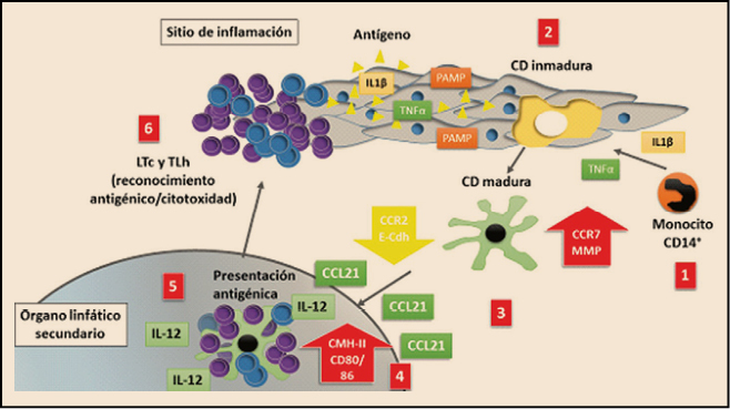 Existe una amplia variedad de métodos de activación de las células dendríticas, principalmente con IL-1β, IL-6, factor de necrosis tumoral (TNF), interferones alfa y gamma (IFN-α, IFN-γ), prostaglandinas (PGE2) y ácido poliinosínico: policitidílico (poly I: C)6. Es común también la utilización de productos de origen microbiano que actúan a través de receptores tipo Toll (TLR7), lectinas tipo C y receptores tipo NOD (NLR8); así como la de subpoblaciones de linfocitos T, NK y γδ; proteínas co-estimuladoras como CD40 y citocinas proinflamatorias como IL1β, factor de necrosis tumoral (TNF), IL-6 y prostaglandina E2.