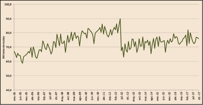 Como complemento de lo anterior, en la Figura 3 se visualiza la evolución mensual de las recetas dispensadas con cargo al SNS en el mismo periodo. En este caso se distingue claramente la única medida que ha tenido verdadero impacto sobre la demanda de medicamentos, el RDL 16/2012 (julio de 2012) y, también refleja claramente cómo, tras la brusca caída de la demanda, la serie aumenta desde el nuevo nivel de consumo marcado por la aplicación del RDL 16/2012.