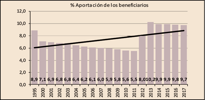 En cuanto a la aportación que realizan los beneficiarios, se ha incrementado un 1,5% respecto a la del año anterior. En total, los beneficiarios han aportado 1.217 millones de euros, el 9,7% del importe de la facturación a PVPIVA, ligeramente por debajo de la aportación realizada en 2016 en el que la aportación por este concepto representó el 9,8% de la facturación de ese año.
