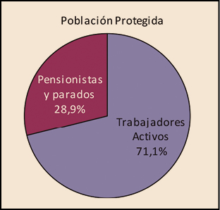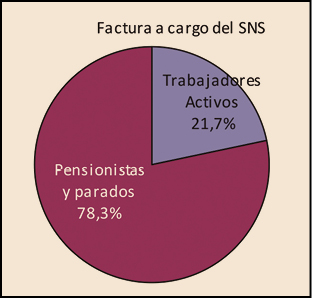 Desde la entrada en vigor del RDL 16/2012, de 20 de abril, los beneficiarios del Sistema Nacional de Salud (CC AA e Ingesa), se agrupan en dos grandes colectivos: el de los trabajadores activos, que representan el 71,1% de la población protegida y del de los pensionistas y parados sin prestación de desempleo, que representan el 28,9%2. Sin embargo, el nivel de gasto de cada uno de estos colectivos es muy diferente. Mientras que el gasto para el SNS de los trabajadores activos3 supone el 21,7% del gasto total del SNS, el de los pensionistas es el 78,3%, tres veces superior al de los trabajadores activos, a pesar de que éstos son más del doble en número que los pensionistas y parados.