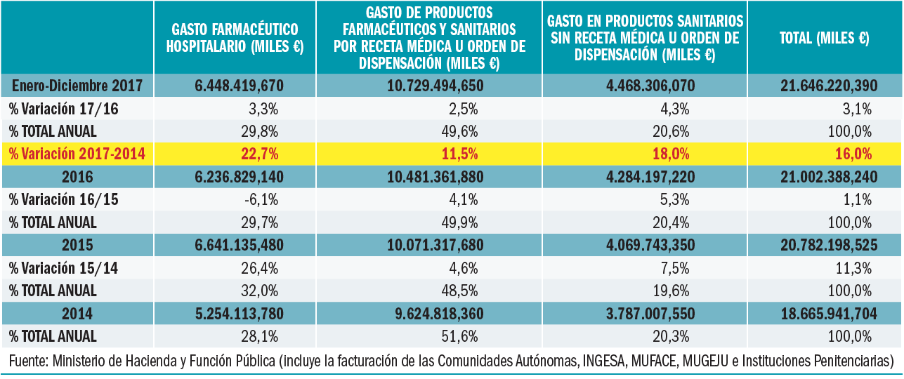 El volumen generado por la utilización de medicamentos y productos sanitarios financiados por el Sistema Nacional de Salud valorado a PVPIVA en 2017 ha aumentado un 2,1% respecto al año anterior, mientras que el importe de la factura final a cargo de la Administración – deducida la aportación de los beneficiarios y de los agentes del sector – se ha incrementado un 2,5% respecto a 2016.