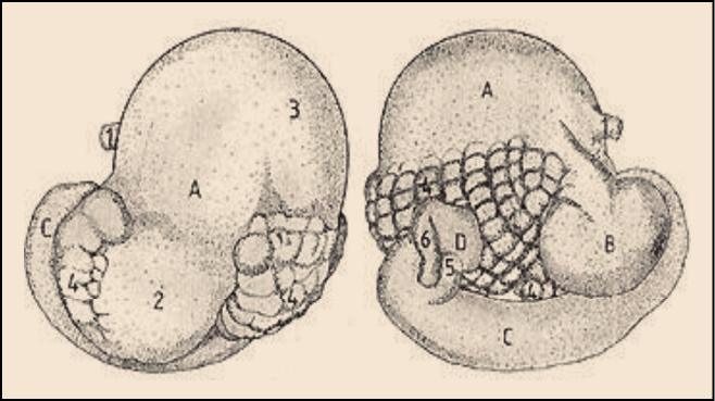 Figura 3. A la izquierda: vista izquierda de los compartimientos del estómago de la llama. A la derecha, vista derecha de los mismos. A, B y C: compartimiento 1, 2 y 3 respectivamente; D, ámpula duodenal. 1, esófago; 2 saco craneal del compartimiento 1; 3, saco caudal de compartimiento 1; 4, área saculada; 5, píloro; 6, duodeno (Vallena
