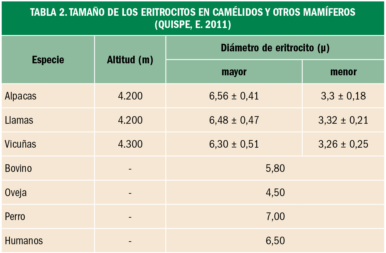 Los glóbulos rojos (GR) de las llamas son de menor tamaño que en otras especies (diámetro mayor 6,3-6,56 µm, diámetro menor 3,25-3,32 µm); son células elipsoides, sin biconcavidad que normalmente no presentan palidez central Los recuentos eritrocitarios son relativamente altos en comparación con otras especies domésticas (13