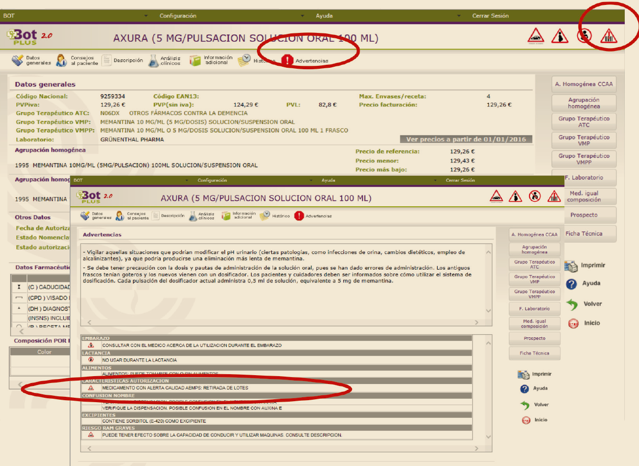 Esta información la podemos encontrar también dentro de la pestaña de “Advertencias” de medicamentos (Figura 1).