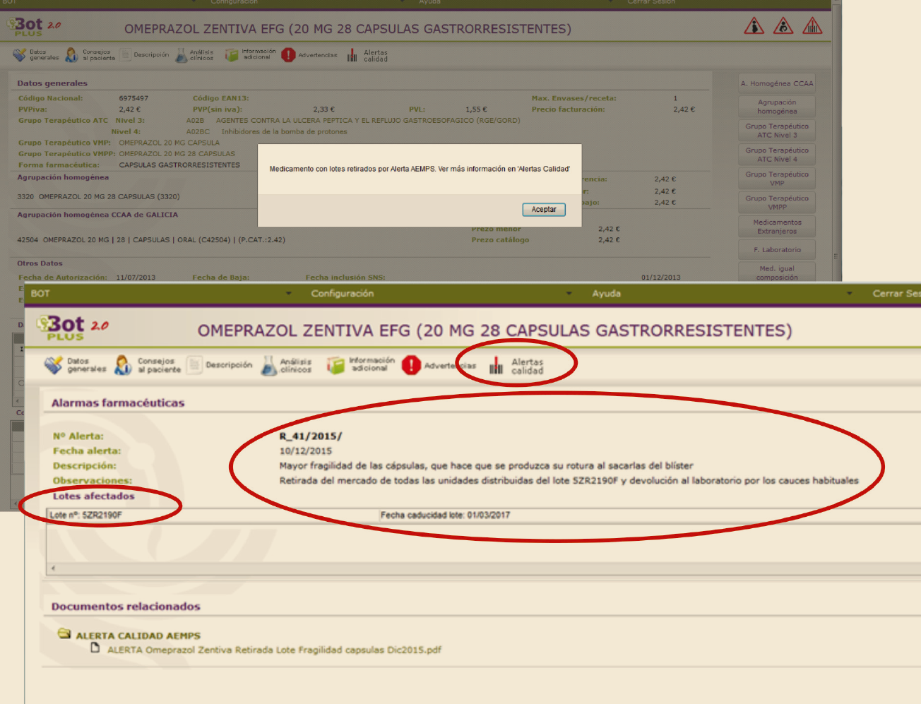 Desde el Consejo General se informa puntualmente a los Colegios y a los colegiados sobre la información profesional que publica la Agencia Española de Medicamentos y Productos Sanitarios (AEMPS) relativa a notificaciones sobre seguridad y/o calidad de los medicamentos. Además de enviarse por Circular y publicarse en PORTALFARMA, esta información oficial se incorpora a Bot PLUS de forma codificada para que, al acceder a la ficha del medicamento afectado, el programa avise sobre esta posible alerta y ofrezca información adicional al respecto. A continuación se describen las opciones de consulta de esta información: