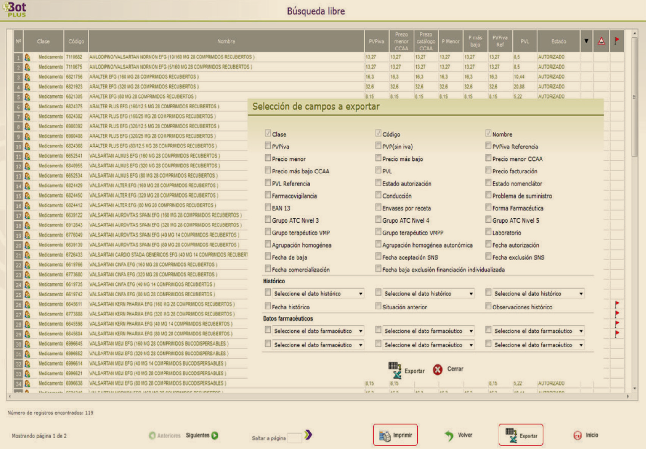 El listado generado puede posteriormente imprimirse o exportarse a un fichero Excel, dándonos la opción Bot PLUS en este último caso de personalizar nuestro listado, exportando los campos que nos pudieran interesar (Figura 6).