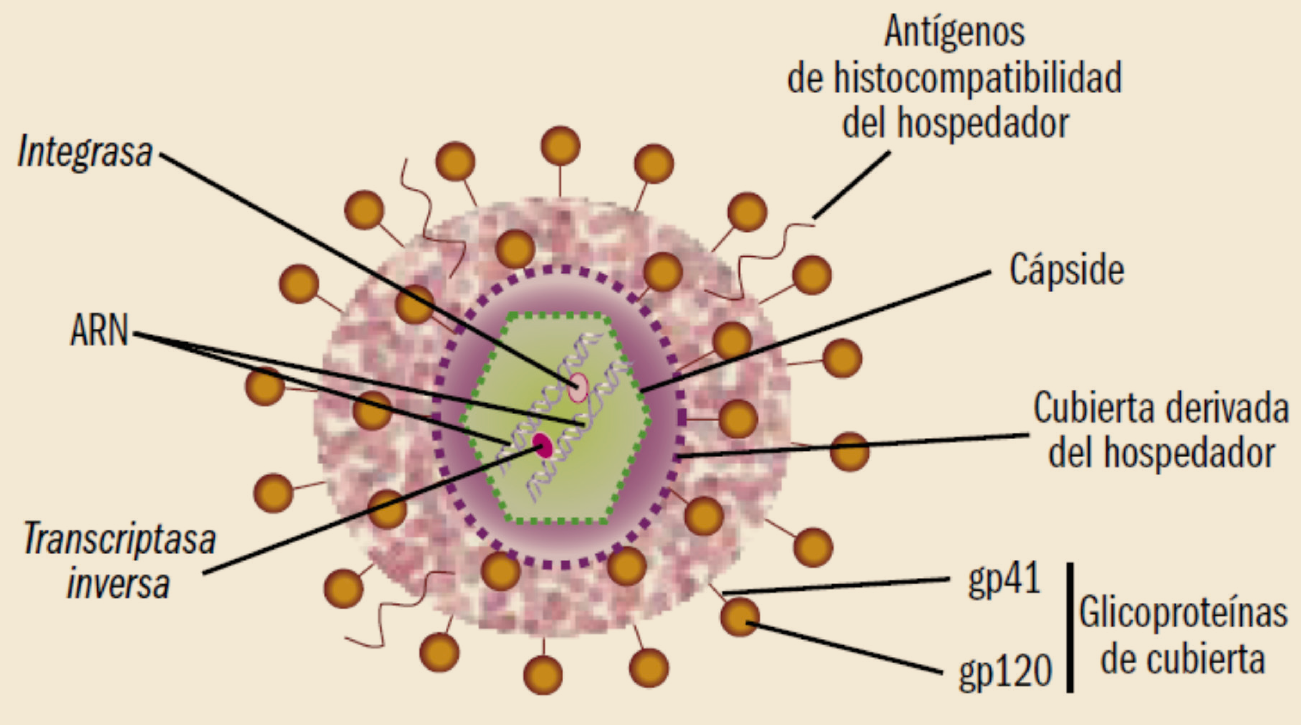 El VIH forma parte de los lentivirus (familia Retroviridae, género Lentivirus), una subfamilia cuyo nombre alude a la forma insidiosa (lenta e inicialmente desapercibida) en que se desarrolla su infección. Sin embargo, el VIH tiene una cinética de replicación muy agresiva, y muy diferente a la que suelen presentar los lentivirus (Fernández del Pozo, 2011). Los VIH son virus de geometría esférica y diámetro medio aproximado de 100 nm (Figura 1). La capa más externa o envuelta está formada por una membrana con alto contenido en lipoproteínas. En dicha membrana se insertan antígenos de histocompatibilidad (HLA) del hospedador y diversos complejos heterodiméricos de glucoproteínas, compuestos por trímeros de la glicoproteína de superficie gp-120 y de la glicoproteína transmembrana gp-41, que le permitirán una primera unión a la célula hospedadora. Por debajo de la membrana lipídica se encuentra la matriz proteica, formada por la proteína p-17, que recubre la cápside propiamente dicha, constituida por la proteína p-24 (uno de los marcadores más comúnmente usados en el diagnóstico de la infección por VIH). En el interior de la cápside se encuentra el material genético, que se presentará como dos hebras idénticas de ARN monocatenario, junto con algunas enzimas como la transcriptasa inversa y la integrasa. El tamaño del genoma del VIH es inferior a 10.000 nucleótidos y contiene varios genes: tres genes principales (gag, pol y env) que codifican, cada uno, varias proteínas (estructurales, enzimas y glicoproteínas de la cubierta viral, respectivamente) y varios genes que codifican proteínas reguladoras (tat, rev, vif, vpu, nef y vpx).