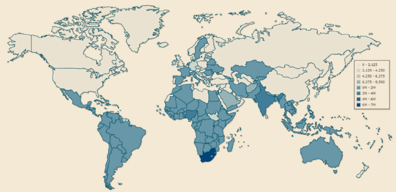 Figura 3. Mapa de prevalencia de VIH en 2018. Datos expresados en millones de casos. (http://www.indexmundi.com/map/?v=32&l=es).