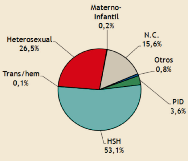 Figura 4. Vías de transmisión en los nuevos contagios por VIH en España en 2016. NC: no consta información.