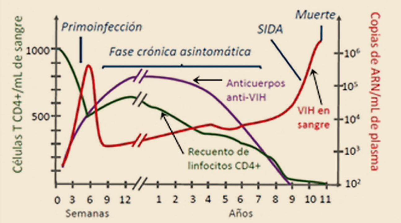 A la fase aguda de la infección le sigue una fase asintomática (fase crónica no SIDA) de duración variable pero raramente inferior a 18 meses, durante la que el virus continúa replicándose masivamente en diferentes compartimentos orgánicos, siendo solo parcialmente controlado por la activación constante de la respuesta inmunitaria natural del organismo; esto provoca un estado inflamatorio de carácter crónico que puede mantenerse por largos períodos de tiempo (Figura 5).