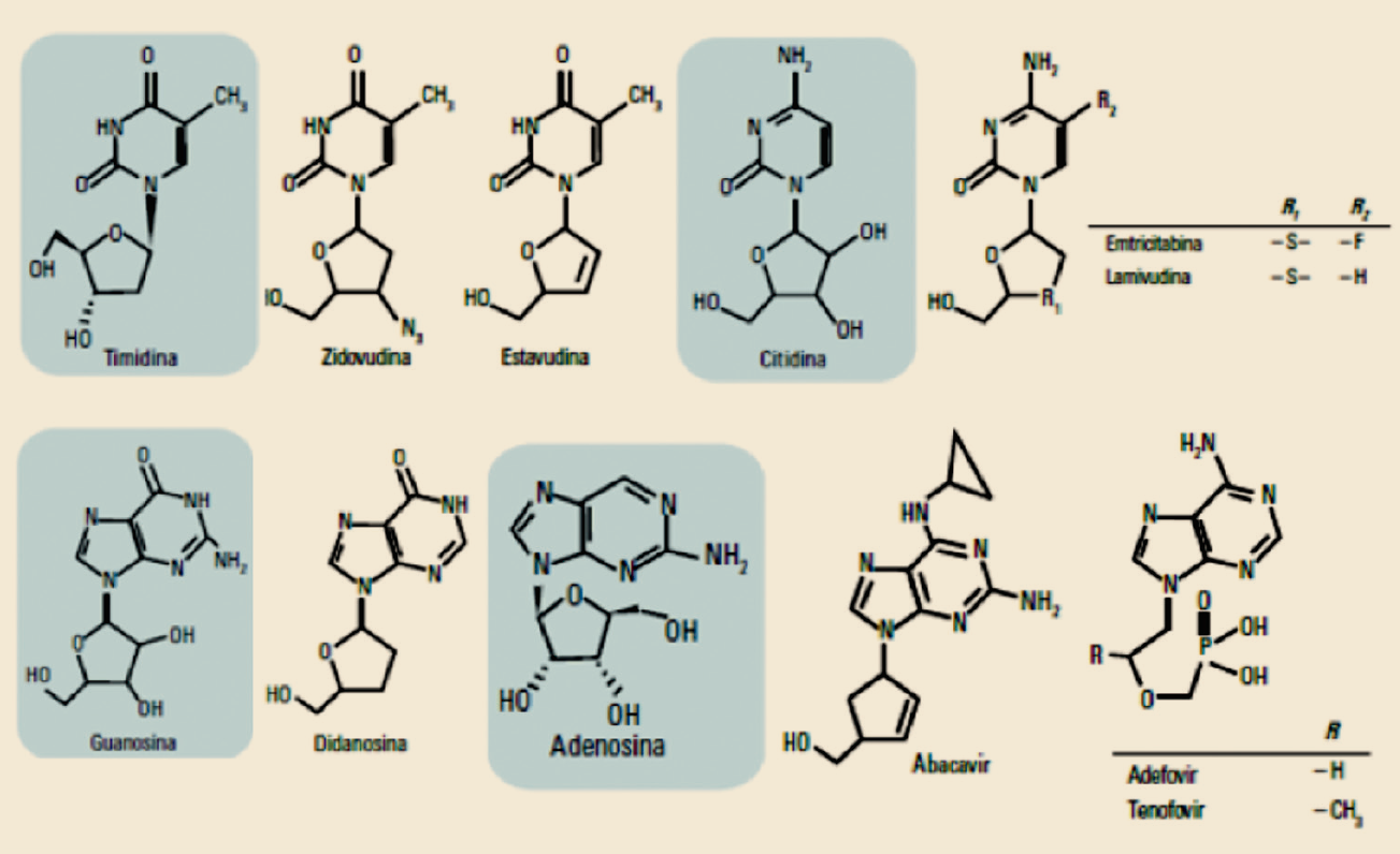 Fue el primer grupo de fármacos anti-VIH. Las primeras moléculas que surgieron son análogos de los nucleótidos naturales, capaces de impedir la síntesis de ADN viral a partir de la cadena de ARN infectante. Actúan como finalizadores de la síntesis de la cadena, pues la enzima viral transcriptasa inversa los incorpora como eslabones en la cadena del ADN en formación y son terminadores del proceso, ya que es incapaz de unir posteriormente el siguiente eslabón nucleotídico. De esa forma, el ADN viral no se incorpora a la dotación genética de la célula infectada. Estos ITIAN precisan transformarse en sus derivados fosforilados en el interior celular para ejercer su acción, y su efecto farmacológico se produce únicamente cuando la célula se encuentra en fase de replicación, siendo ineficaces frente a los virus en células en fase de reposo (Figura 7). La zidovudina fue el primer fármaco anti-VIH (comercializado en 1987), sobre el que hay una mayor experiencia clínica, y aún se considera como base importante del tratamiento.