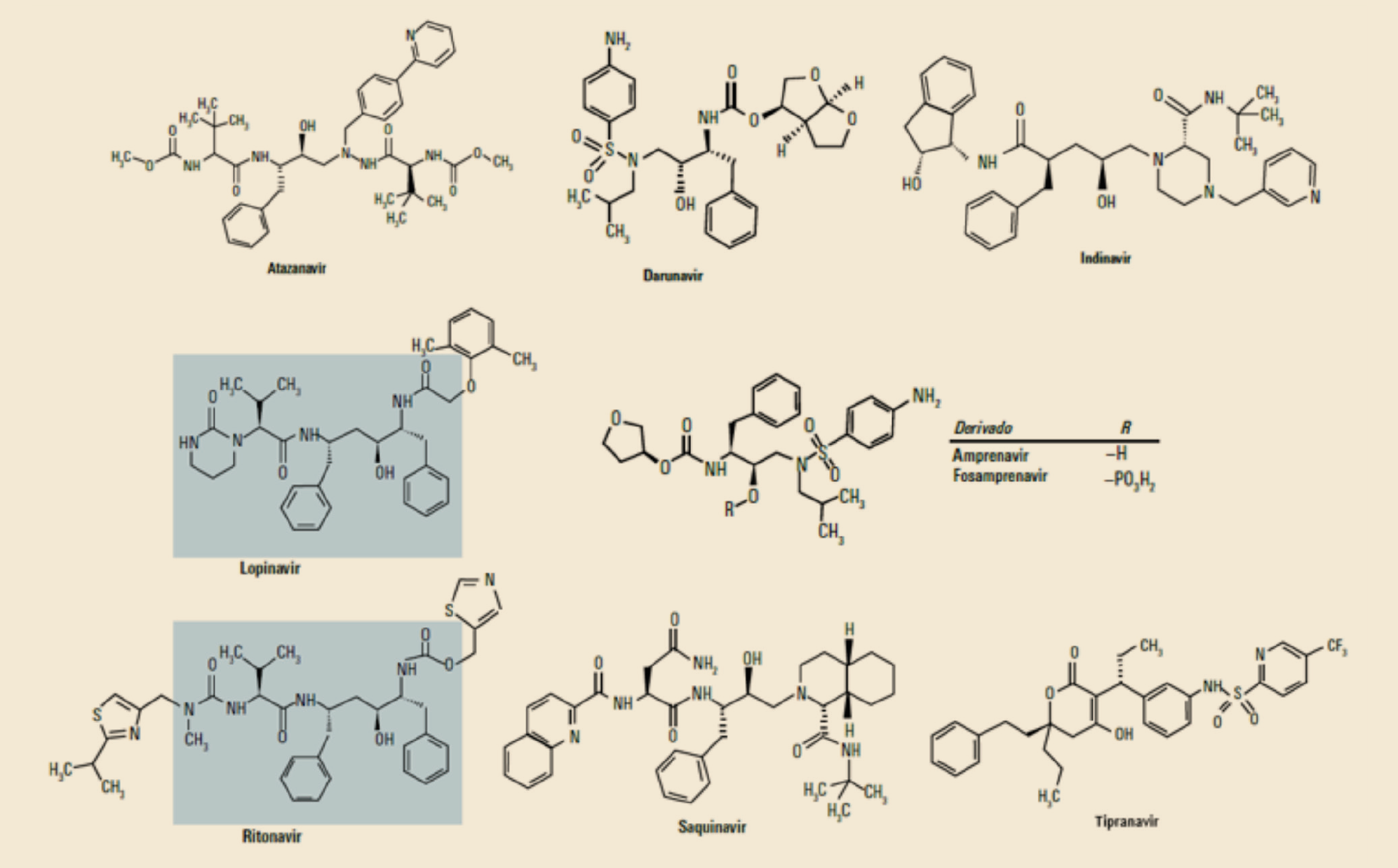 En la actualidad los IP disponibles en España son 8: atazanavir (Reyataz®), darunavir (Prezista®), indinavir (Crixivan®), lopinavir, fosamprenavir (Telzir®), ritonavir (Norvir®, EFG), saquinavir (Invirase®), y tipranavir (Aptivus®) (Figura 9). Salvo indinavir (prácticamente en desuso) y ritonavir, todos ellos se emplean en clínica potenciados con ritonavir o cobicistat (Tybost®); de hecho, cobicistat ha sido recomendado por la Agencia Europea de Medicamentos para potenciar atazanavir o darunavir, existiendo presentaciones coformuladas con ellos.