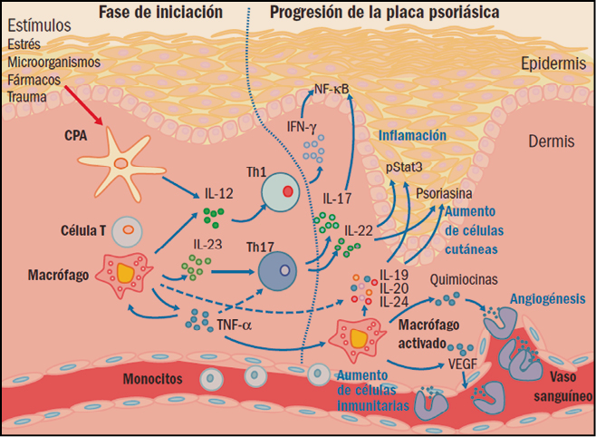 Asimismo, se ha observado que las interleucinas (IL) 12e IL-23 pueden tener también un importante papel patológico en la psoriasis. La IL-12 –producida por las células presentadoras de antígenos– es capaz de inducir la producción de nuevas poblaciones de linfocitos T e incrementar las respuestas de los linfocitos Th1, sobre todo en la producción de interferón (IFN). Estas células también parecen estimular la inmunidad mediada por células y la síntesis de anticuerpos fijadores del complemento. Por su parte, la IL-23 facilita la adquisición de memoria inmunológica por los linfocitos T, en especial de las subpoblaciones de linfocitos Th17, y parece tener un papel crítico en la patogénesis de la psoriasis. En este sentido, datos procedentes de modelos inflamatorios de la piel sugieren que los linfocitos Th17, que producen IL-17 e IL-22, podrían ser los inductores principales de la hiperplasia epidérmica, modificando la diferenciación epidérmica en la psoriasis.