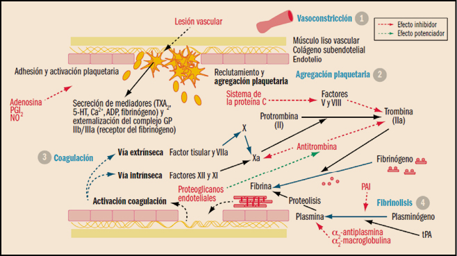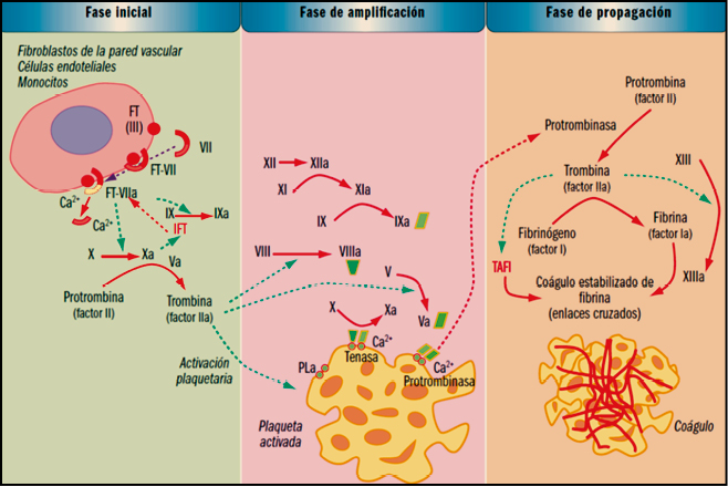 La otra opción terapéutica, que es la más frecuentemente empleada, es el eptacog alfa activado (rFVIIa, NovoSeven®). Se trata de una forma recombinante del factor VII activado –obtenido en células BHK– que fue inicialmente desarrollado para tratar pacientes hemofílicos con inhibidores del factor VIII, pero que después ha demostrado también su utilidad en situaciones que cursan con sangrado incoercible que no responden a las medidas quirúrgicas y médicas convencionales. La unión del factor VII activado al factor tisular expuesto en la superficie de fibroblastos o células endoteliales desencadena la cascada de coagulación mediante la activación secuencial de los diferentes factores de coagulación (IXa, Xa y trombina).