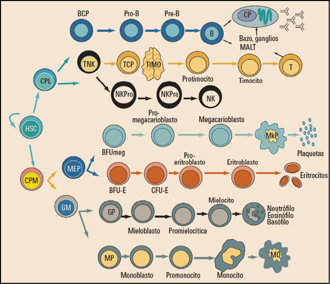 Figura 1. Modelo general de hematopoyesis. BCP: células progenitoras de linfocitos B; BFU: unidad formadora de brotes; CFU: unidad formadora de colonias; CPL: células progenitoras linfoides; CPM: células progenitoras mieloides; GM: células precursoras de granulocitos y macrófagos; GP: células precursoras de granulocitos; HSC: células madre pluripotenciales; MEP: células progenitoras de megacariocitos y eritrocitos; MkP: megacariocito; MO: macrófago; MP: células precursoras de monocitos; NKPre: células precursoras de células NK; NKPro: células progenitoras de células NK; TCP: células progenitoras de linfocitos T; TNK: células progenitoras de linfocitos T y NK.