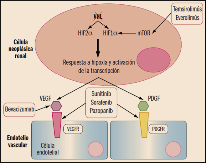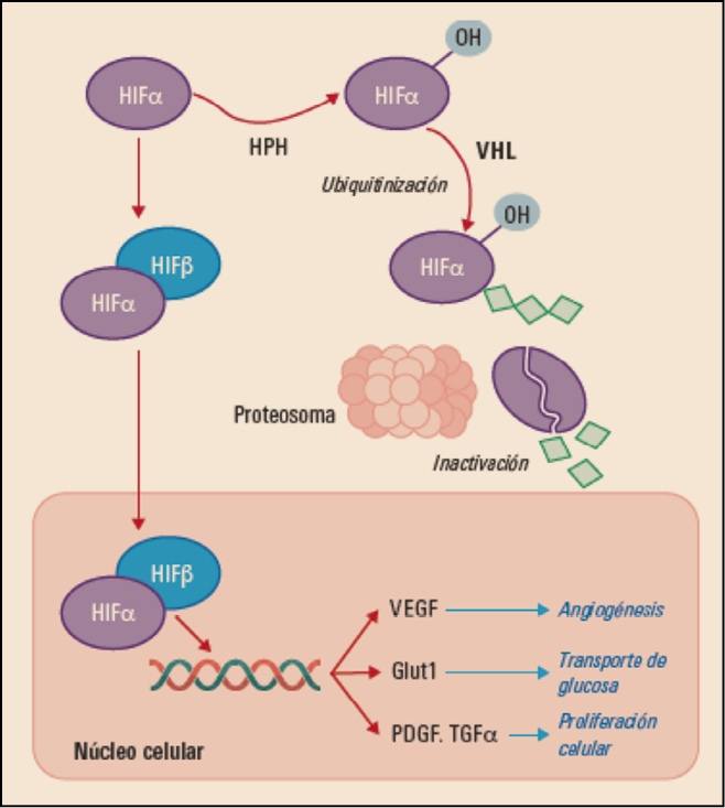 El supresor tumoral VHL se inactiva por mutación o silenciamiento epigenético en aproximadamente el 80% de los casos esporádicos de carcinoma renal de células claras (CRCC). La deficiencia de VHL en CRCC impulsa la angiogénesis, la invasión local y la metástasis mediante la activación de la respuesta hipóxica regulada por el factor inducible por hipoxia (hypoxia-inducible factor, HIF). A concentraciones bajas de oxígeno, los factores de transcripción HIF1α/HIF2α inducen la expresión de genes de respuesta hipóxica incluyendo factores angiogénicos tales como VEGF y PDGF (factor de crecimiento derivado de plaquetas; Platelet-derived Growth Factor), proteínas pro-invasoras que promueven la transición epitelial-mesenquimal y enzimas que facilitan el metabolismo anaeróbico. En condiciones normales (normoxia), VHL canaliza a HIF1α/HIF2α para su degradación dependiente de ubiquitina por el proteasoma. Sin embargo, la pérdida de la función VHL conduce a la estabilización de los factores de transcripción HIF y la consiguiente expresión de sus genes diana. En células tumorales deficientes en VHL y células endoteliales, el HIF2α es considerado como el principal regulador positivo de la tumorigénesis y la angiogénesis. Precisamente, la activación de la señalización de VEGFR y PDGF como resultado de la deficiencia de VHL subyace a la actividad clínica de agentes antiangiogénicos en CRCC.