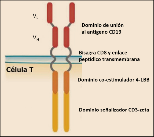 Tisagenlecleucel es un novedoso tratamiento de inmunoterapia consistente en células T autólogas modificadas genéticamente ex vivo mediante el empleo de un vector lentiviral para expresar un receptor de antígeno quimérico (CAR) anti–CD19. Tras la unión de los linfocitos T reprogramados que expresan CAR a las células que expresan CD19 –células del linaje B desde etapas tempranas de su desarrollo a células plasmáticas, tanto malignas como normales–, la proteína quimérica transmite las señales intracelulares necesarias para activar la citotoxicidad frente a esas células CD19+, así como una señal que favorece la expansión de las células T y la persistencia de tisagenlecleucel. Se trata de la primera terapia celular CAR-T disponible comercialmente en España.