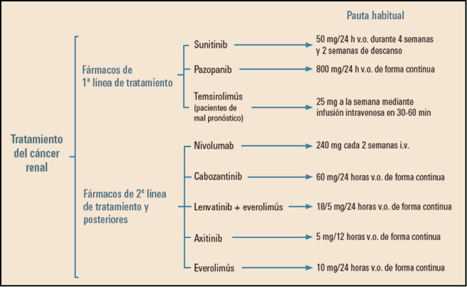 Figura 3. Fármacos de primera y segunda línea en el cáncer renal. i.v.: intravenoso; v.o.: vía oral.