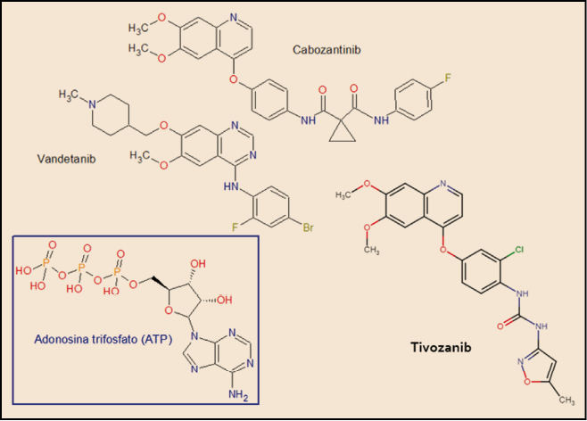 El tivozanib está estrechamente relacionado estructural y farmacológicamente con otros miembros de la serie de inhibidores de proteína cinasas y, en particular con el cabozantinib y el vandetanib (Figura 4). Como otros miembros de la serie de inhibidores de proteína cinasas, es el resultado de la optimización funcional mediante modelización molecular a partir de una serie de 2-fenilaminopirimidinas, de donde surgió el imatinib, cabeza de serie del grupo. En cualquier caso, todos ellos guardan –en mayor o menor grado– una familiaridad química con la molécula de ATP (o, en su caso, con la de GTP, como sucede en las cinasas MAPK), con la que compiten para provocar el bloqueo de la cinasa correspondiente. Se han desarrollado modelos moleculares de relación estructura-actividad para este grupo de sustancias. En todos los casos, las interacciones estéricas y electrostáticas han demostrado ser las más determinantes para el efecto inhibitorio sobre la tirosina cinasa.