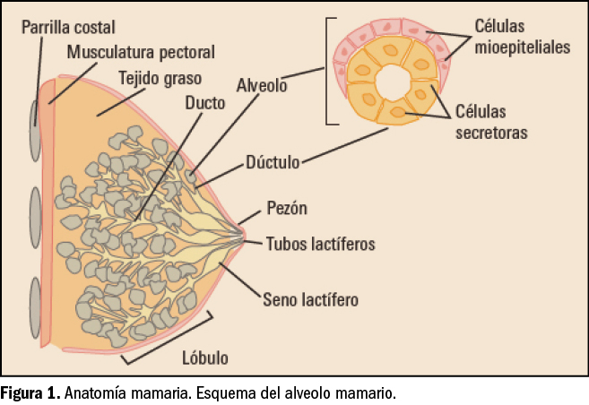 El cáncer de mama se define como el crecimiento desenfrenado de células malignas en el tejido mamario con capacidad invasora y metastatizante. En el 99% de los casos, el cáncer de mama se desarrolla en mujeres. Los 2 tipos principales de cáncer de mama son el carcinoma ductal –el más frecuente–, que comienza en los conductos que llevan leche desde la mama hasta el pezón, y el carcinoma lobulillar, que comienza en los lobulillos, que producen la leche materna (Figura 1).