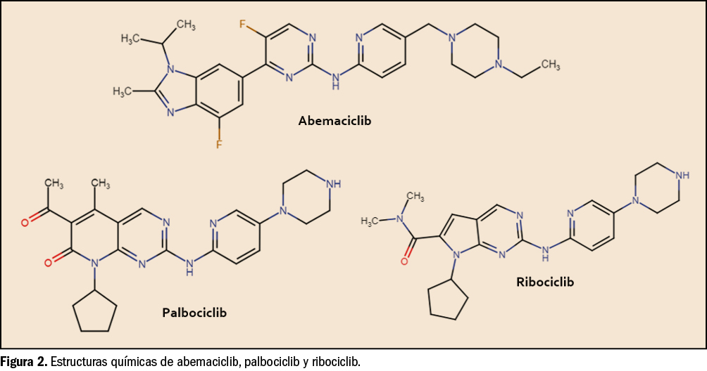 El abemaciclib es un compuesto estructuralmente muy similar a los otros dos fármacos de su grupo terapéutico: palbociclib y ribociclib (Figura 2), con los que comparte un núcleo central de un anillo de piridina unido por enlace amina a una pirimidina. Éstos contienen núcleos análogos al de purina, en una estructura que emula a la del ATP y, como tal, actúan como inhibidores selectivos y reversibles de las cinasas dependientes de ciclinas CDK4 y 6, al competir con el ATP en el proceso de fosforilación, bloqueándolo.