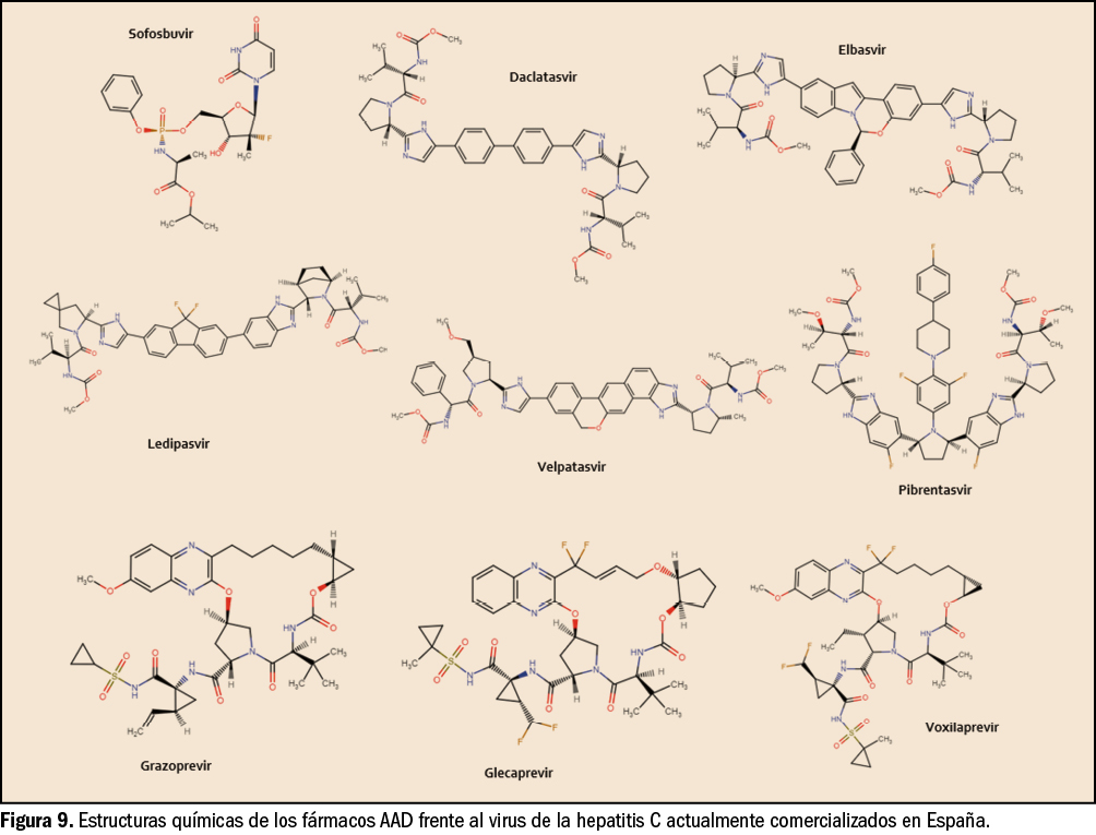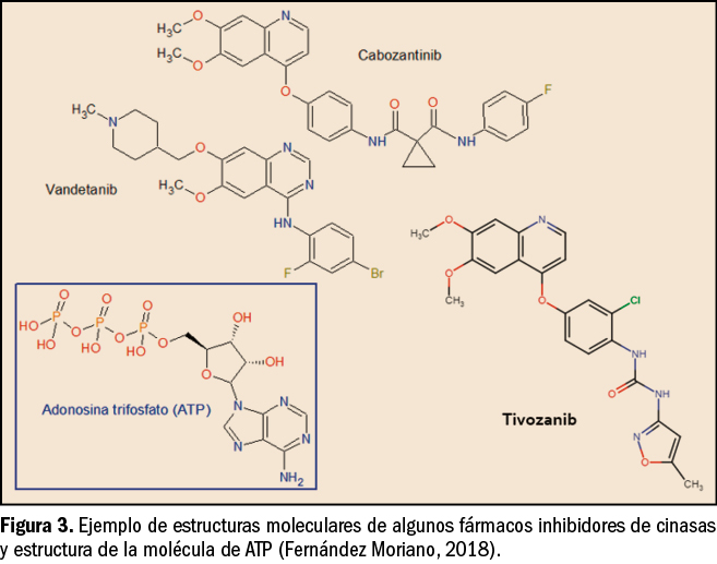 Por extensión, estas moléculas recuerdan a las de otros miembros de la serie de inhibidores de proteína cinasas (Figura 3), que han resultado de la optimización funcional mediante modelización molecular a partir de una serie de 2-fenilaminopirimidinas, de donde surgió el imatinib, cabeza de serie del grupo. Todos ellos guardan –en mayor o menor grado– una familiaridad química con la molécula de ATP (o, en su caso, con la de GTP, como sucede en las cinasas MAPK), con la que compiten para provocar el bloqueo de la cinasa correspondiente. Se han desarrollado modelos moleculares de relación estructura-actividad para este grupo de sustancias y, en todos los casos, las interacciones estéricas y electrostáticas han demostrado ser las más determinantes para el efecto inhibitorio sobre las cinasas.