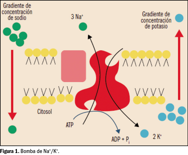 El potasio (K+) es uno de los minerales más abundantes en el organismo. Su distribución es mayoritariamente intracelular (98%), siendo su concentración normal en el interior de la célula de unos 145 mEq/l o mmol/l (5,7 g/l), en tanto que la concentración plasmática (potasemia) normal es de solo 3,5-4,5 mEq/l o mmol/l (137-175 mg/l). Esto supone una fuerte diferencia entre la concentración de potasio en el líquido intra- y extracelular, con un ratio de 35-40:1. Por tanto, para mantener el equilibrio orgánico se requiere la participación de una bomba de membrana celular dependiente de ATP o ATPasa (es decir, que consume energía) que extrae constantemente potasio fuera de la célula, a la vez que introduce sodio (Figura 1). Justamente, esta diferencia de concentración es el principal determinante del potencial de acción de membrana, y resulta fundamental para la función muscular normal (del músculo esquelético y cardiaco), así como para la neurológica.