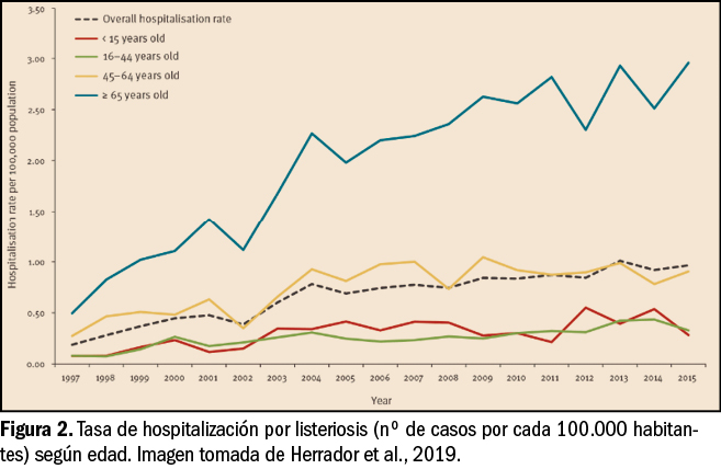 No obstante, algunos expertos apuntan a que la listeriosis es una enfermedad emergente que, por el momento, se considera infradiagnosticada y con importantes lagunas a nivel epidemiológico. Así, un reciente estudio epidemiológico ha analizado los datos –limitados en calidad y cantidad– de hospitalizaciones por listeriosis en España entre 1997 y 2015 (Herrador et al., 2019). En ese periodo, según la base de datos de altas hospitalarias centralizada del Ministerio de Sanidad (Conjunto Mínimo Básico de Datos), se tiene constancia de 5.696 hospitalizaciones con diagnóstico de listeriosis (edad media de los pacientes 58,6 años, 59% hombres). La tasa media fue de 0,67 casos por 100.000 habitantes, con una tendencia creciente en el número de hospitalizaciones durante el período de estudio y con las mayores tasas correspondientes al grupo etario de >65 años, seguido por el grupo de 45 a 64 años (Figura 2).