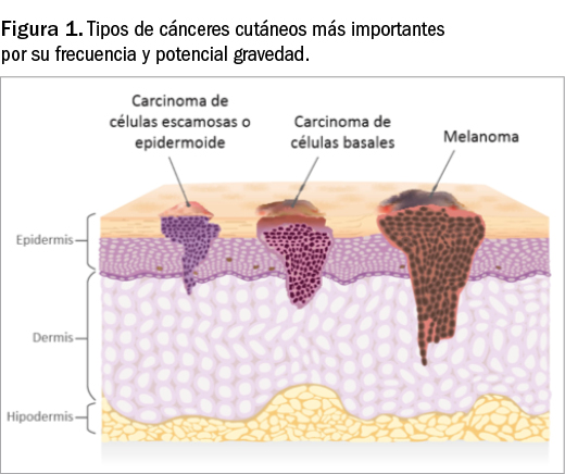 En global, el cáncer cutáneo representa la forma más frecuente de tumor maligno en la población caucásica (más de un tercio de todos los cánceres que afectan al ser humano)1. Con este término nos referimos todas las lesiones malignas que afectan a la piel y sus anejos; a grandes rasgos y considerando las diferencias epidemiológicas y pronósticas, se suelen dividir en dos grandes grupos: el melanoma y el cáncer cutáneo no melanoma (CCNM). En este último grupo se enmarcan las lesiones premalignas o carcinomas localizados in situ (queratosis actínica, enfermedad de Bowen, etc.) y las lesiones malignas más frecuentes en dermatología que derivan de los queratinocitos epidérmicos: el carcinoma basocelular y el carcinoma de células escamosas (Figura 1). Con una menor incidencia y características fisiopatológicas diferentes, así como tratamiento específico, se encontraría el carcinoma de células de Merkel.