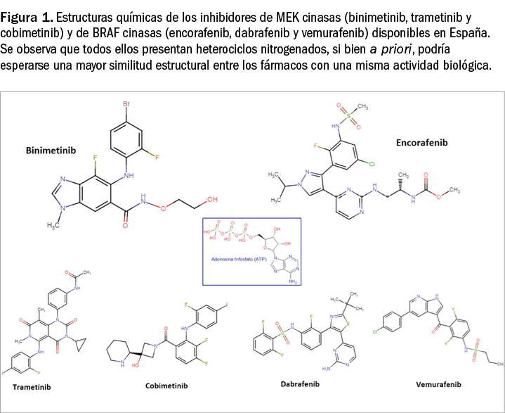 Binimetinib y encorafenib están estrechamente relacionados estructural y farmacológicamente con otros miembros de la serie de inhibidores de proteína cinasas (Figura 1), en la que se encuadran un gran número de principios activos comercializados en España. Como otros miembros de la serie, son el resultado de la optimización funcional mediante modelización molecular a partir de una serie de 2-fenilaminopirimidinas, de donde surgió el imatinib, cabeza de serie del grupo.