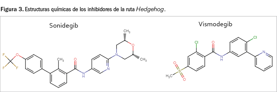 El sonidegib es una pequeña molécula sintética, de carácter policíclico, que guarda cierta similitud estructural –aunque menor de la que cabría esperarse por su coincidencia de mecanismo de acción– con vismodegib (Figura 3). Este último fármaco, que emergió como cabeza de serie de este grupo de productos con potencial antineoplásico, deriva de las observaciones realizadas en la década de los 50 del pasado siglo realizadas con la ciclopamina5, un alcaloide esteroídico presente en la planta Veratrum californicum, que está estructuralmente relacionado con la jervina (de hecho, vismodegib es la 11-desoxojervina).