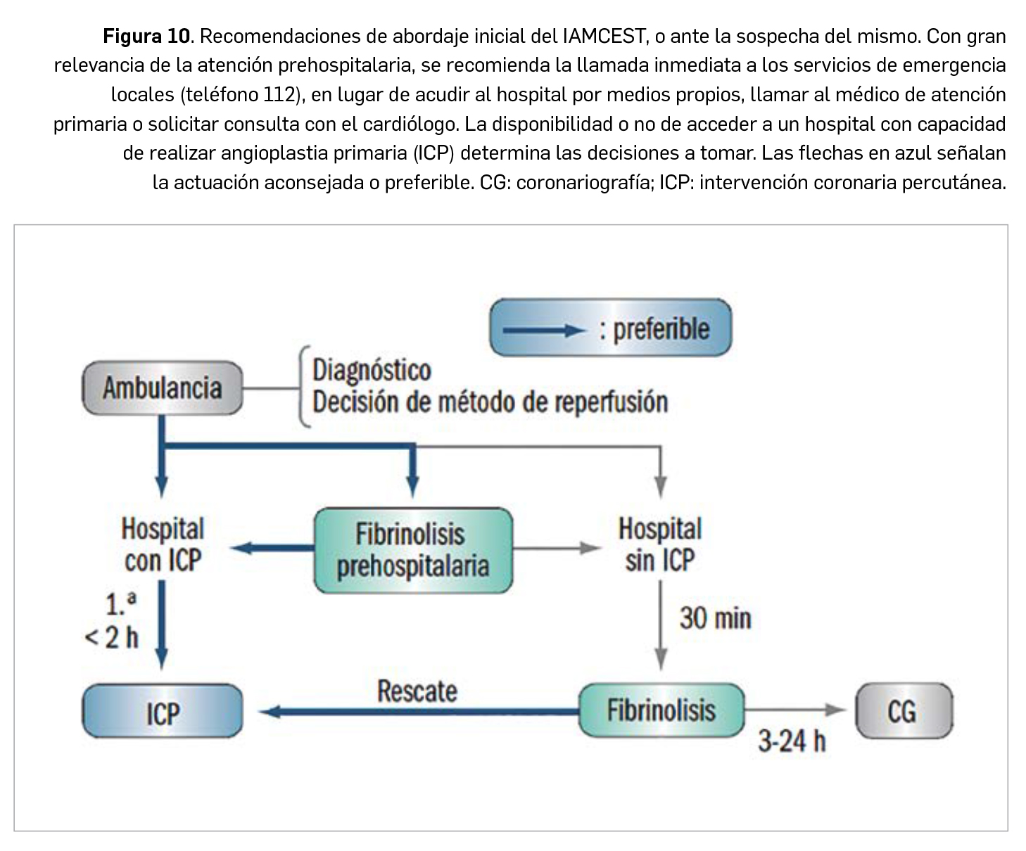 La FASE HOSPITALARIA se inicia con la llegada del paciente al servicio de Urgencias, donde el objetivo primario será identificar la isquemia miocárdica aguda con rapidez, diferenciar entre SCACEST y SCASEST, y estratificar el riesgo del paciente (ECG, anamnesis, exploración física y biomarcadores séricos) para dirigir el tratamiento. El primer paso del mismo será la reperfusión coronaria, siempre en las primeras 12 h tras el inicio de los síntomas y cuando se verifica la elevación del segmento ST del ECG. Se recomiendan dos métodos (Figura 10):