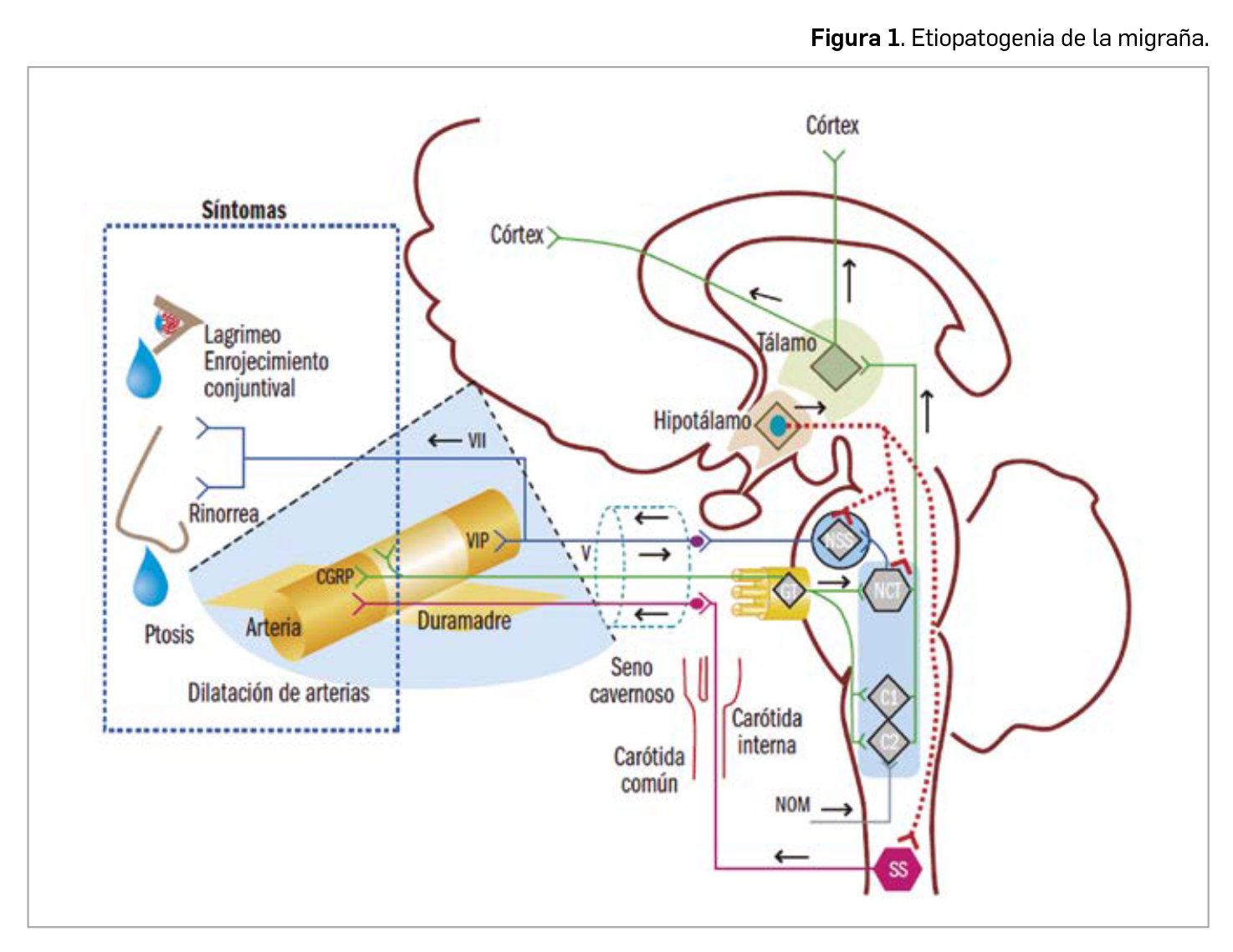 El nervio trigémino (V) transmite las sensaciones dolorosas de la piel, la duramadre y los vasos sanguíneos. Después de hacer sinapsis en el ganglio trigeminal (GT), conecta con el núcleo caudal del trigémino (NCT). Las aferencias perivasculares del trigémino pueden activarse de forma antidrómica y liberar péptido relacionado con el gen de la calcitonina (CGRP, por sus siglas en inglés), lo que provoca vasodilatación, pues las fibras nociceptivas trigeminales positivas para CGRP forman un rico plexo en los vasos sanguíneos intracraneales. El NCT y los segmentos medulares C1-C2 conforman el complejo trigémino cervical que tiene conexiones con el nervio occipital mayor (NOM), el hipotálamo y el núcleo salivar superior (NSS). La conexión entre el sistema trigeminal y el parasimpático facial (VII) se produce al nivel del NSS y constituye el denominado reflejo trigémino autonómico. Las fibras parasimpáticas del facial (VII) alcanzan los vasos sanguíneos, donde liberan péptido intestinal vasoactivo (VIP) de efecto vasodilatador y causan la sintomatología autonómica parasimpática (enrojecimiento conjuntival, lagrimeo, rinorrea). Las fibras simpáticas (SS) abandonan la médula espinal a nivel T1 y también modulan el dolor. En el seno cavernoso confluyen el trigémino y las fibras simpáticas y parasimpáticas. El hipotálamo tiene proyecciones hacia el NCT, NSS y las fibras simpáticas.