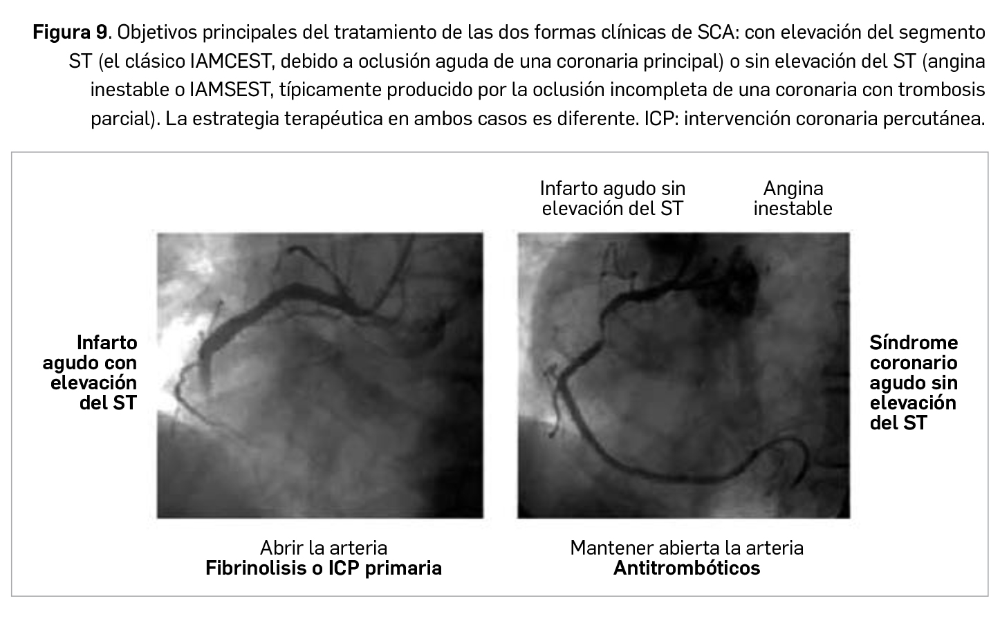 - Trombólisis: la administración de farmacoterapia fibrinolítica está indicada cuando la ICP se vaya a retrasar más de 120 min y siempre durante las primeras 12 h desde el comienzo de los síntomas, si bien la amplia disponibilidad de centros dotados de ICP ha reducido su frecuencia de uso. De forma óptima, se debería iniciar inmediatamente en el servicio de urgencias (o en la propia ambulancia, si es posible) a fin de reducir el tiempo puerta-pinchazo a < 30 min. No obstante, se encuentra contraindicada en casos de hemorragia activa o diátesis hemorrágica (excepto menstruación), ictus hemorrágico o isquémico en los 3 meses previos (excepto evento isquémico agudo en las 3-4,5 h previas), neoplasia intracraneal o medular, malformación arteriovenosa, sospecha o confirmación de disección de aorta o traumatismo craneal o facial cerrado en los 3 meses previos. Si fracasa la trombólisis, e incluso en los pacientes que se reperfunden con buenos resultados con este método, se recomienda el traslado rápido a un hospital donde se pueda realizar la angiografía y la ICP de rescate lo más pronto posible (en las primeras 3-24 h posteriores a la fibrinólisis), ya que así reduce el riesgo de isquemia recidivante, reinfarto, insuficiencia cardiaca, shock cardiogénico o muerte en aproximadamente un 35%.