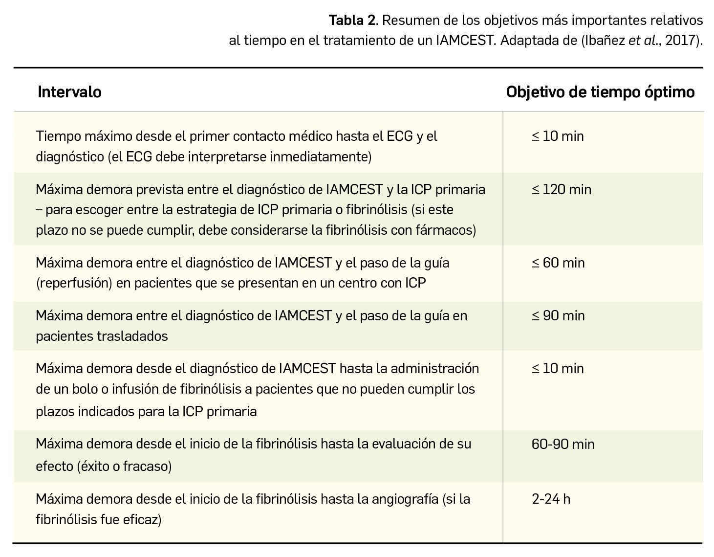 Así pues, el tratamiento del SCACEST debe comenzar de forma óptima en el mismo momento del diagnóstico. Las directrices europeas vigentes (Ibañez et al.; 2017), que se comentarán a continuación, establecen diferentes objetivos y recomendaciones según la fase que se considere: antes, durante o después del ingreso hospitalario.