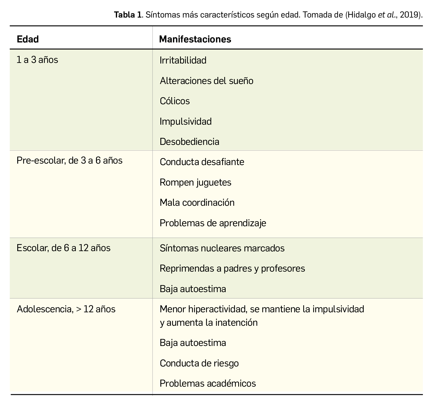 Los tres síntomas cardinales del TDAH son déficit atencional, hiperactividad e impulsividad. A pesar de todo, el TDAH es muy heterogéneo, presentando distintas manifestaciones clínicas según edad (Tabla 1), sexo, comorbilidades y características individuales del paciente. La incapacidad para mantener la atención es el síntoma que durante más tiempo acompaña al individuo a lo largo de su vida, mientras que la impulsividad e hiperactividad predominan más durante la niñez. Conviene recordar que los síntomas se aprecian fácilmente en situaciones en las que se necesita un esfuerzo mental o mantener la atención de manera continuada, mientras que disminuyen en momentos organizados, novedosos y estructurados. Es por ello que, cuando el alumno con TDAH goza de la supervisión individual adecuada, presenta una disminución de los síntomas y un mejor rendimiento académico.