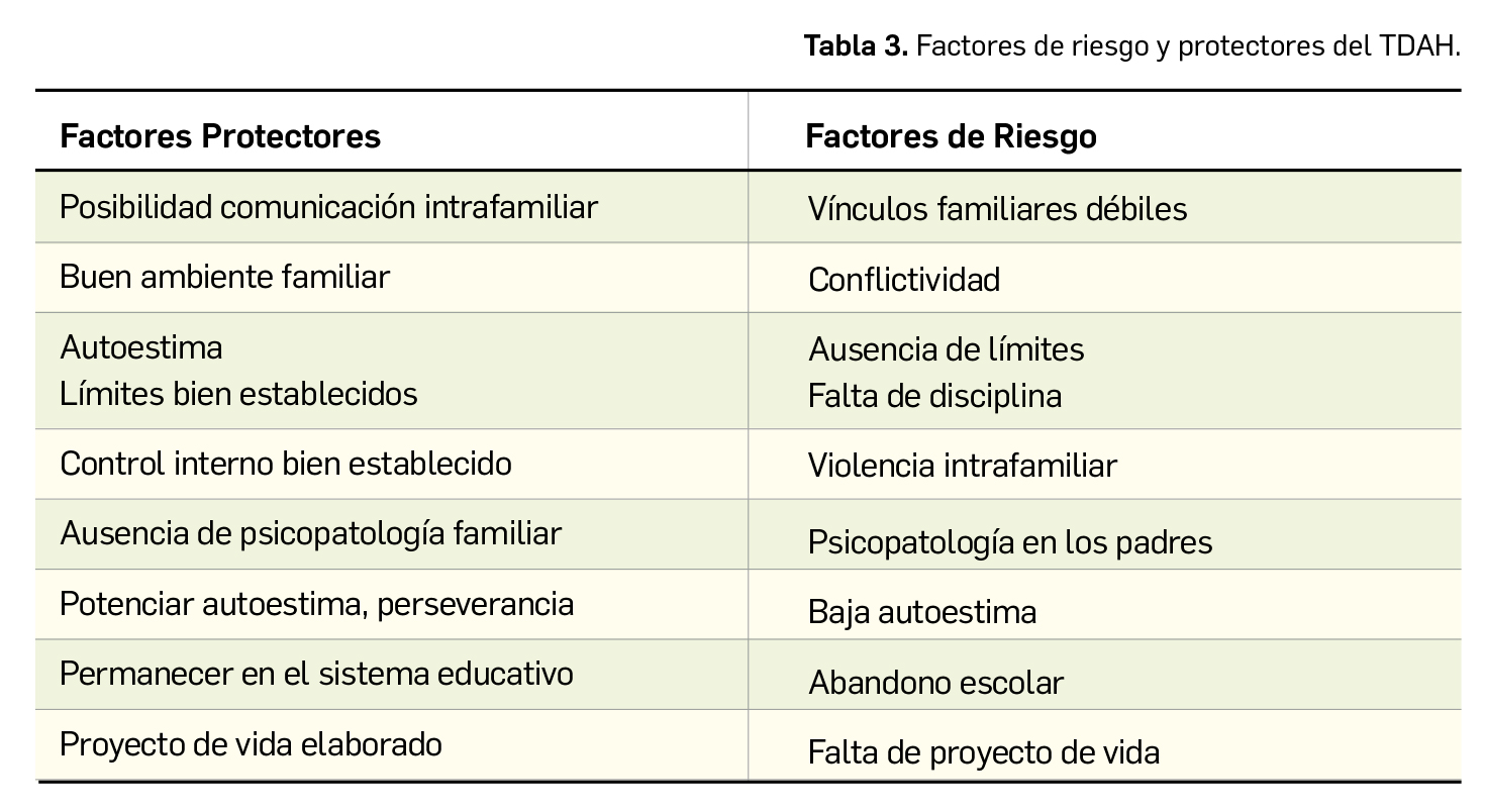 En relación con factores de riesgo, existe una asociación entre el TDAH y la prematuridad, infecciones del sistema nervioso central y algunas cromosomopatías, como el síndrome de Williams Beuren y “síndrome X frágil” entre otros. Los factores ambientales contribuyen a matizar la expresión clínica del trastorno, y la influencia de las circunstancias sociales y familiares contribuyen a exacerbar o mitigar la sintomatología y a condicionar la evolución del trastorno.