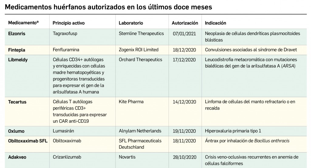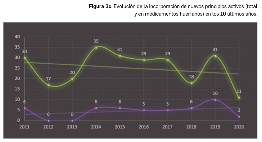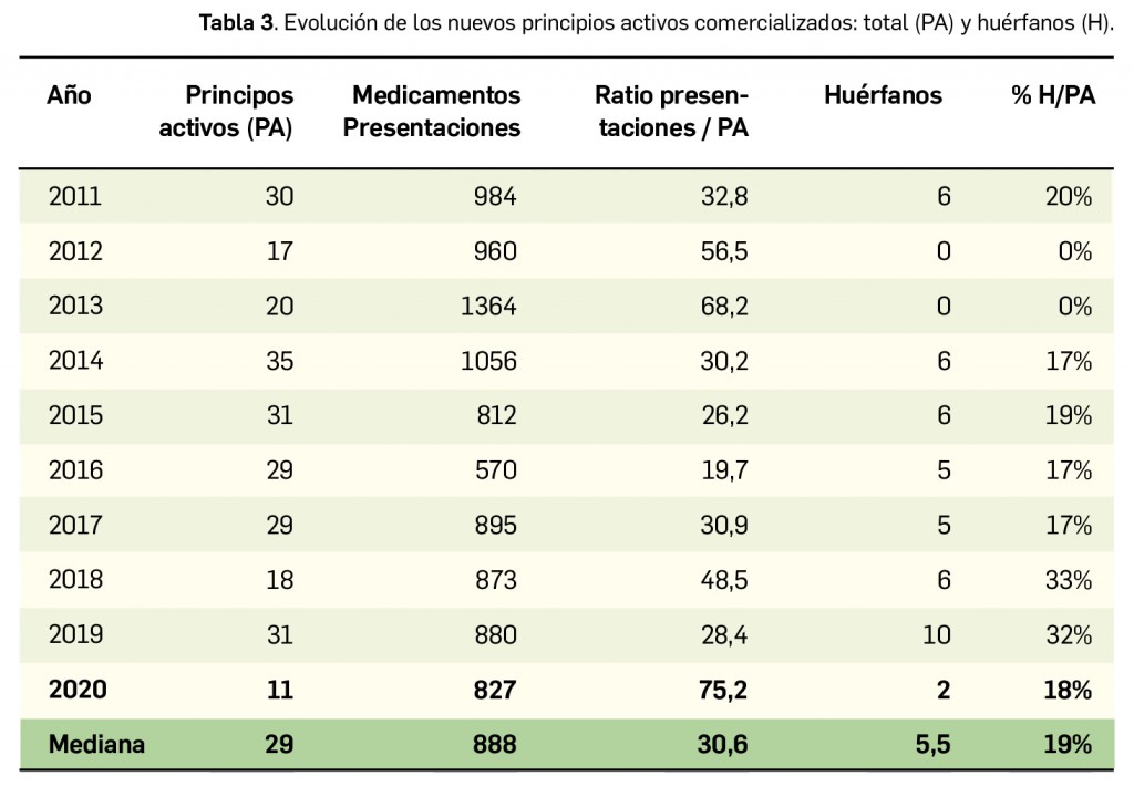 Por lo que se refiere a los nuevos principios activos comercializados en 2020 en nuestro país, han sido un total de 11 –de los cuales, solo 2 han sido incluidos en medicamentos designados como como huérfanos (un 18%)–