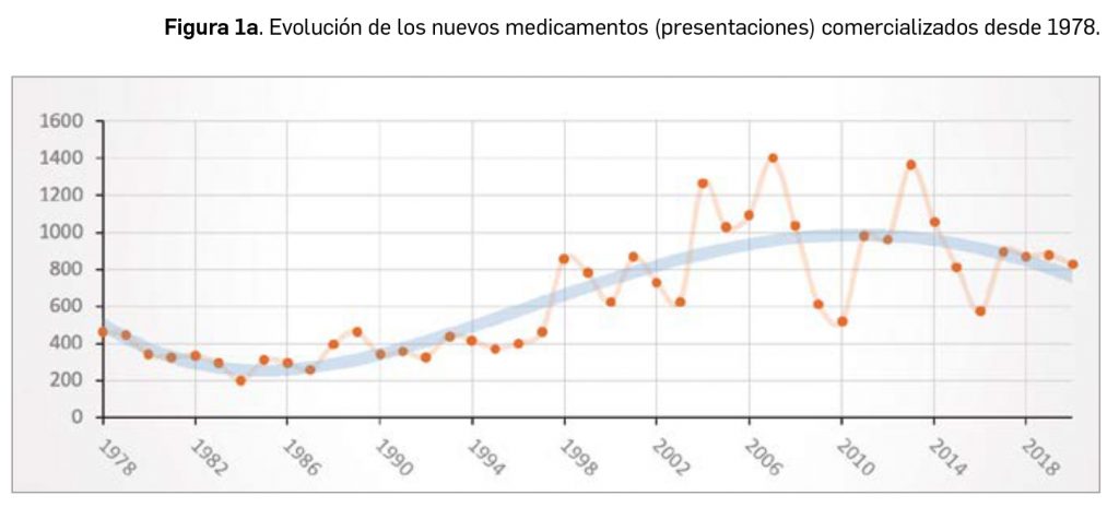 Durante el año 2020, se registraron en España 827 nuevas presentaciones comerciales o formatos de medicamentos, tal y como se recoge en la Tabla 1, incluyendo el 96% de ellas principios activos previamente comercializados. El dato se alinea con la tendencia mostrada en los periodos analizados, en los últimos 42 años (Figura 1a) y en los últimos 10 años (Figura 1b). Cabe destacar, por ejemplo, que un total de 500 presentaciones corresponden a medicamentos genéricos, lo cual representa el 60,5% del total de nuevas presentaciones. Sin embargo, en el último año también se dieron de baja o anularon un total de 949 presentaciones, lo que representa un balance negativo en el número de medicamentos comercializados.