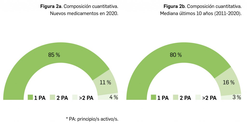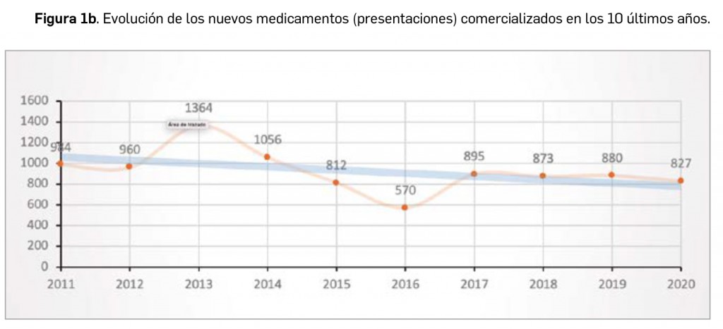 (Tabla 3), 20 menos que el año pasado, lo que representa un número significativamente inferior a la mediana de 29 nuevos principios activos/año correspondiente a la década 2011-2020 (el promedio de nuevos principios activos/año se sitúa en 25,1). Teniendo en cuenta que se han comercializado1 un total de 827 formatos de medicamentos en 2020, se obtiene un promedio de 75,2 presentaciones nuevas de medicamentos por cada nuevo principio activo comercializado1, ampliamente superior a la mediana de la década (30,6). En este sentido, cabe destacar que el 98% de los nuevos medicamentos comercializados durante 2020 incluyeron principios activos autorizados y comercializados en años previos; de ellos, un 2% son presentaciones novedosas de medicamentos ya comercializados previamente, entendiendo como tal aquellas que suponen una innovación en forma farmacéutica y/o vía de administración.