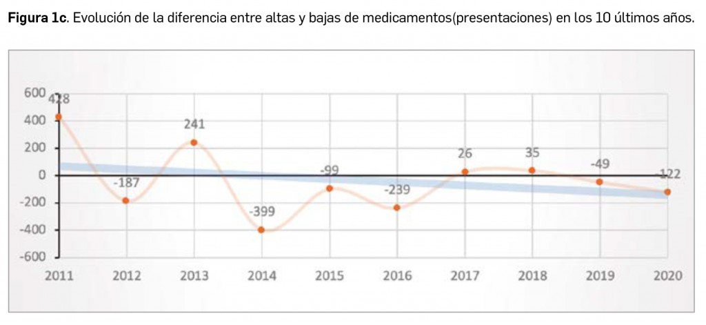 A nivel de volumen de medicamentos, hay que destacar que por cuarto año consecutivo se reduce el número de presentaciones de medicamentos comercializadas, pues en 2020 se han comercializado 827 nuevas presentaciones –tanto de nuevos principios activos como de los ya existentes– frente a las 949 que se han dado de baja. A finales del año, el mercado de medicamentos en España contaba con casi 18.000 formatos o presentaciones comerciales de medicamentos. En la última década se han incorporado 9.221 presentaciones, lo que supone un 51,5% del total, y han desaparecido 9. 586, con un balance negativo de 365 formatos.